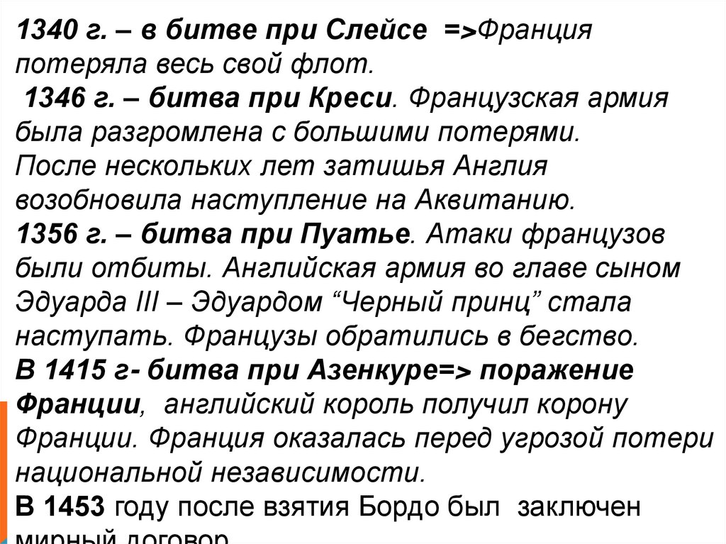 В 1415 г- битва при Азенкуре=> поражение
