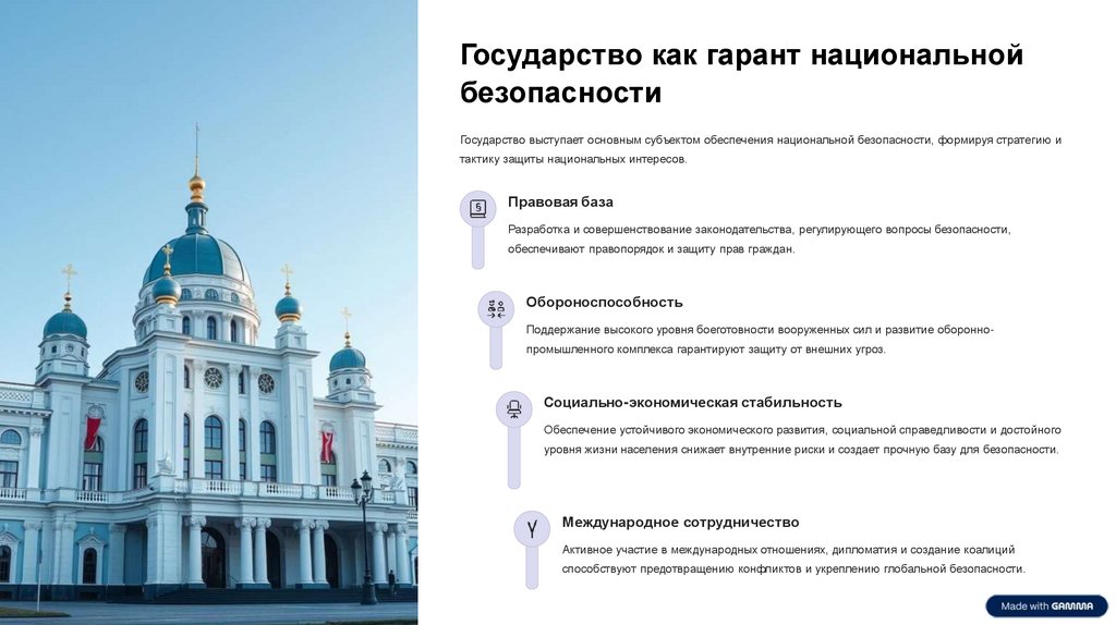 Государство выступает основным субъектом обеспечения национальной безопасности, формируя стратегию и
