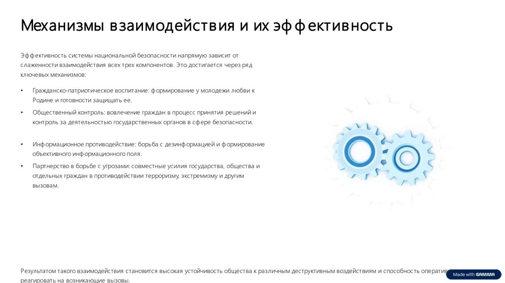 Механизмы в заимодейств ия и их эф ф ектив ностьЭф ф ективность системы национальной безопасности напрямую зависит от