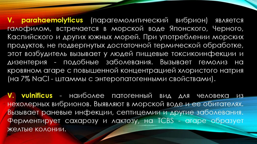 V. parahaemolyticus (парагемолитический вибрион) являетсягалофилом, встречается в морской воде Японского, Черного,
