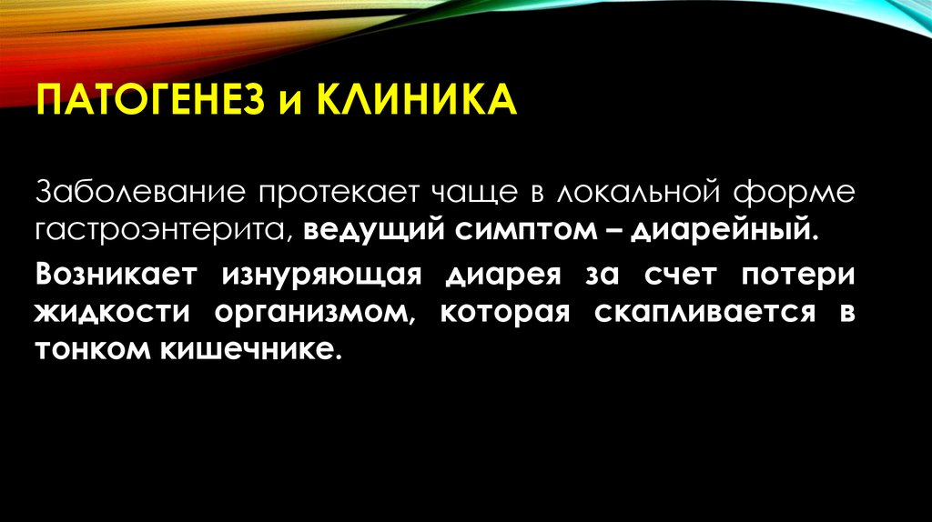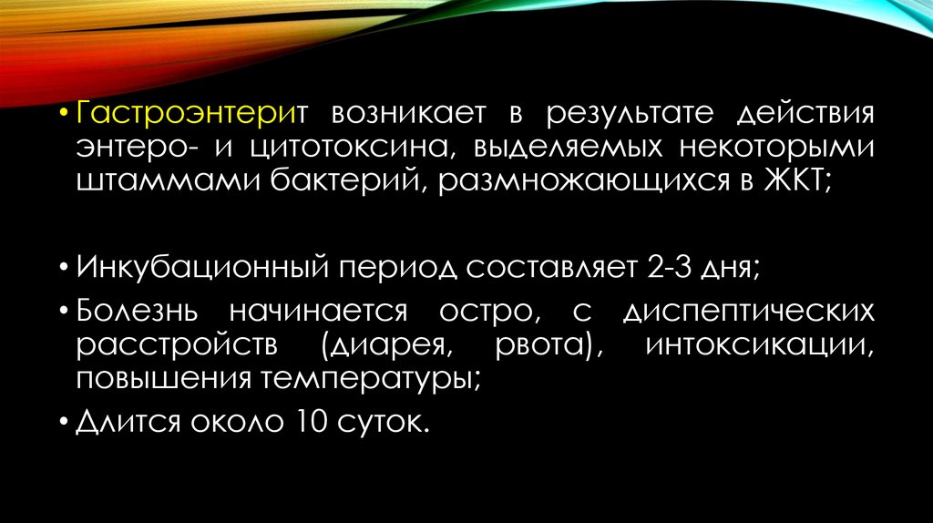 • Гастроэнтерит возникает в результате действияэнтеро- и цитотоксина, выделяемых некоторыми