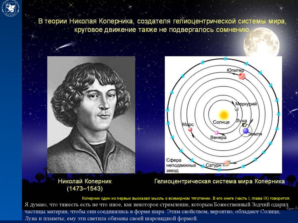 Коперник один из первых высказал мысль о всемирном тяготении. В его книге (часть I, глава IX) говорится:Я думаю, что тяжесть есть не что иное, как некоторое стремление, которым Божественный Зодчий одарил