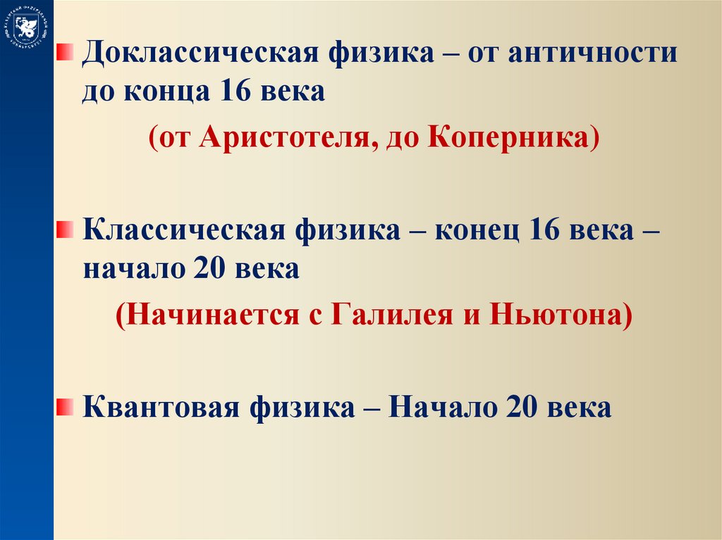 Доклассическая физика – от античностидо конца 16 века