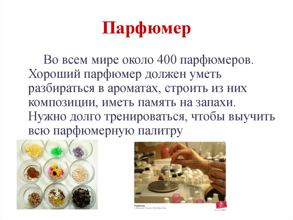 ПарфюмерВо всем мире около 400 парфюмеров.