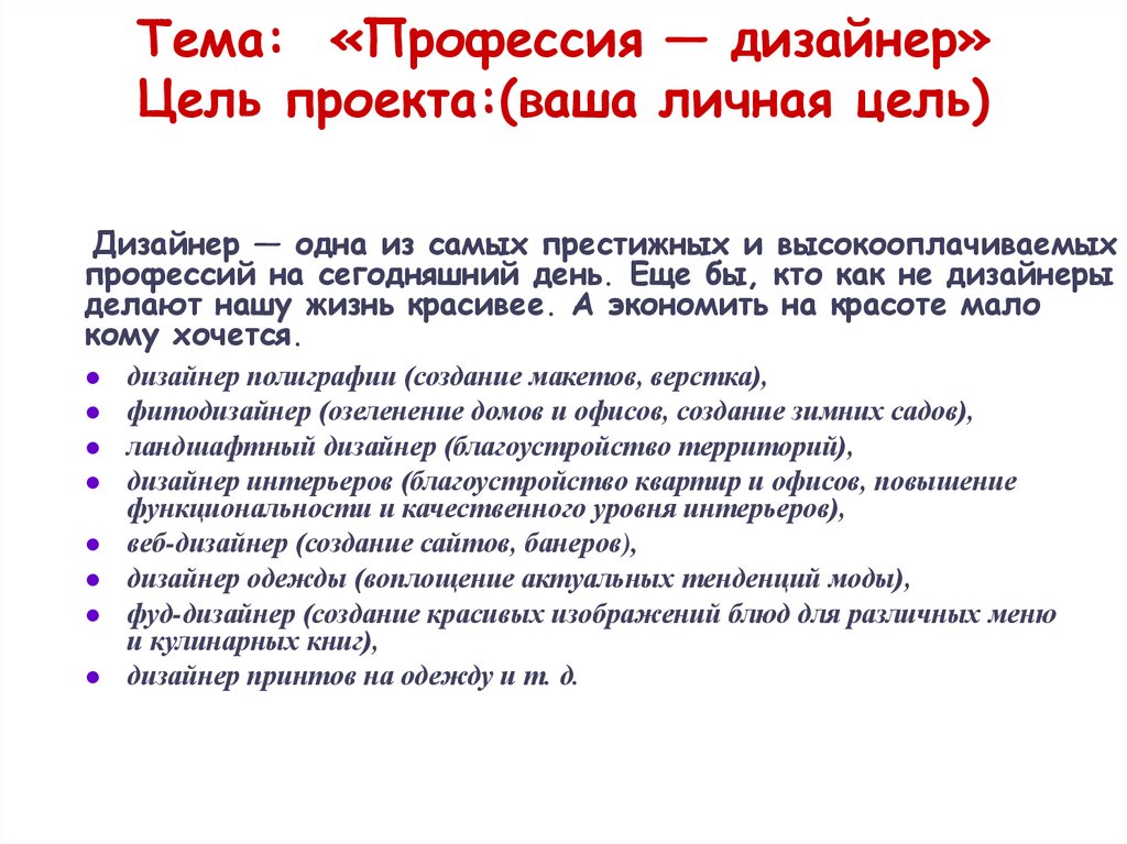 Тема: «Профессия — дизайнер»Цель проекта:(ваша личная цель)