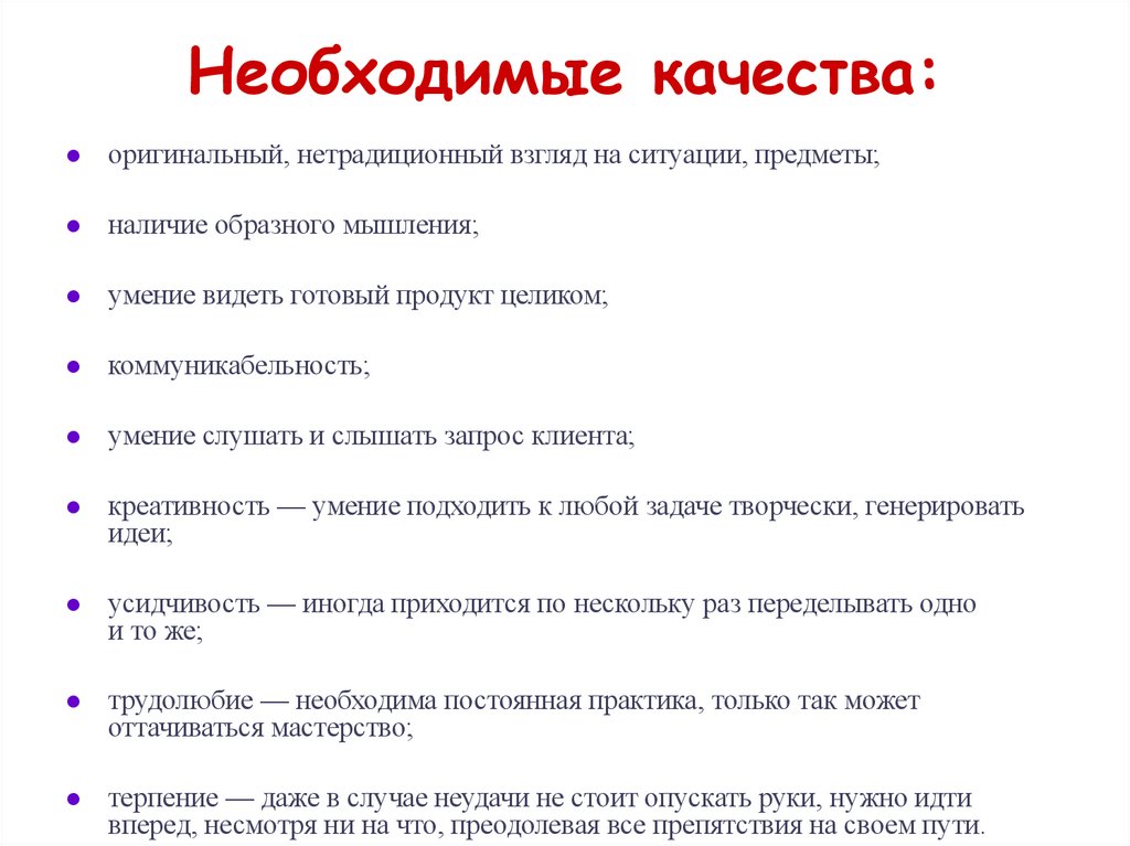 Необходимые качества:оригинальный, нетрадиционный взгляд на ситуации, предметы;