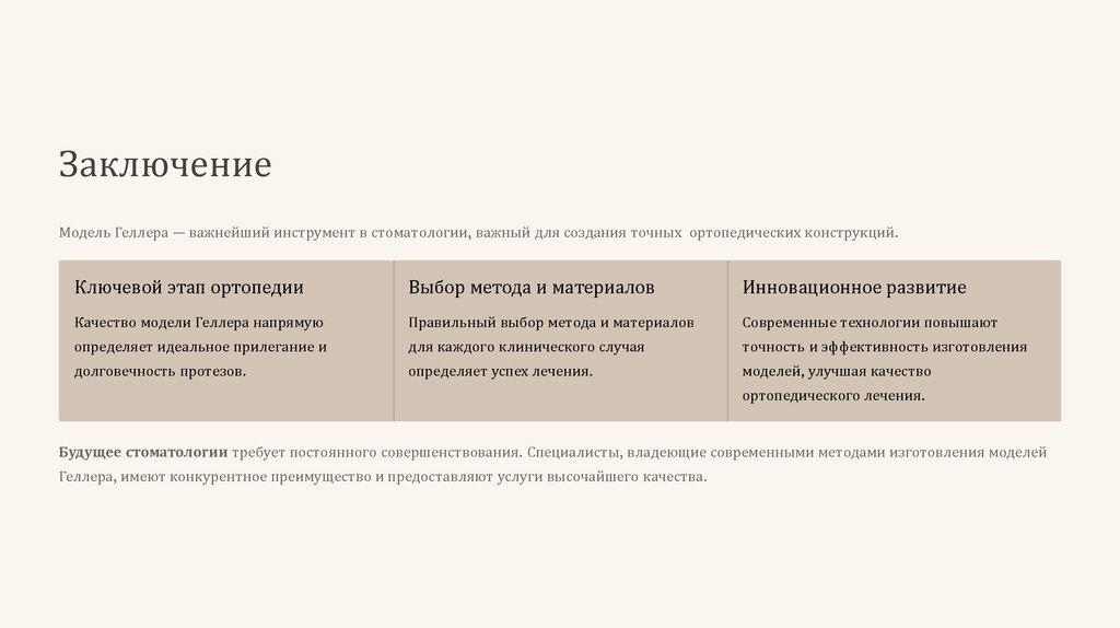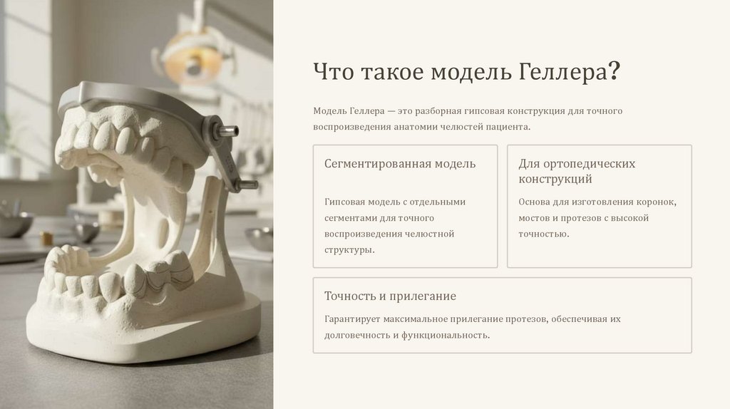 ЗаключениеМодель Геллера — важнейший инструмент в стоматологии, важный для создания точных ортопедических конструкций.