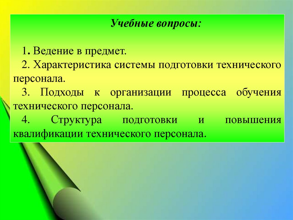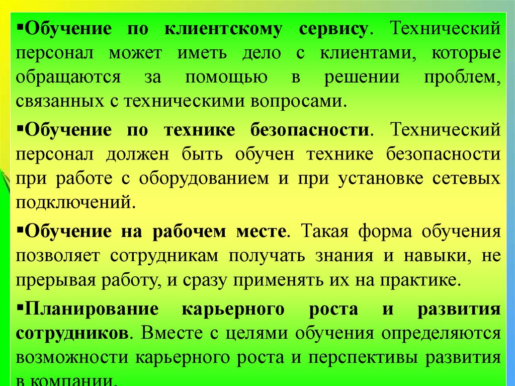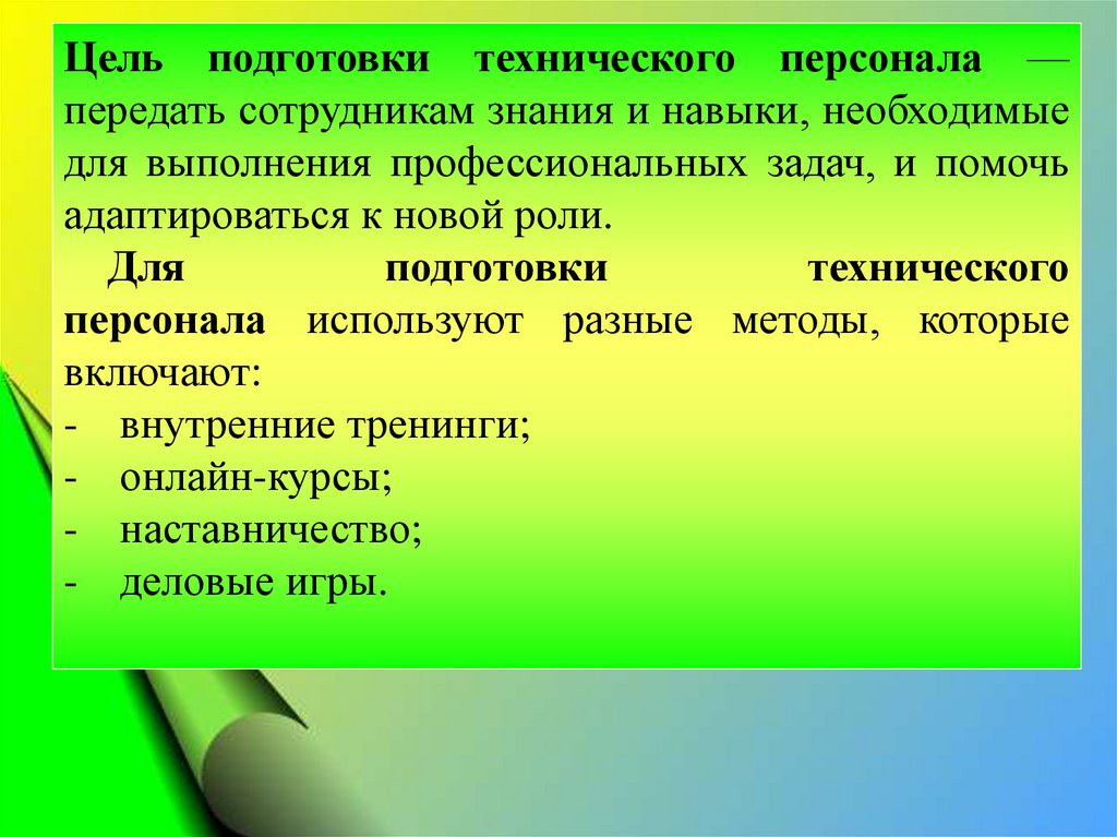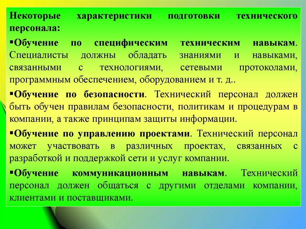 Цель подготовки технического персонала —передать сотрудникам знания и навыки, необходимые