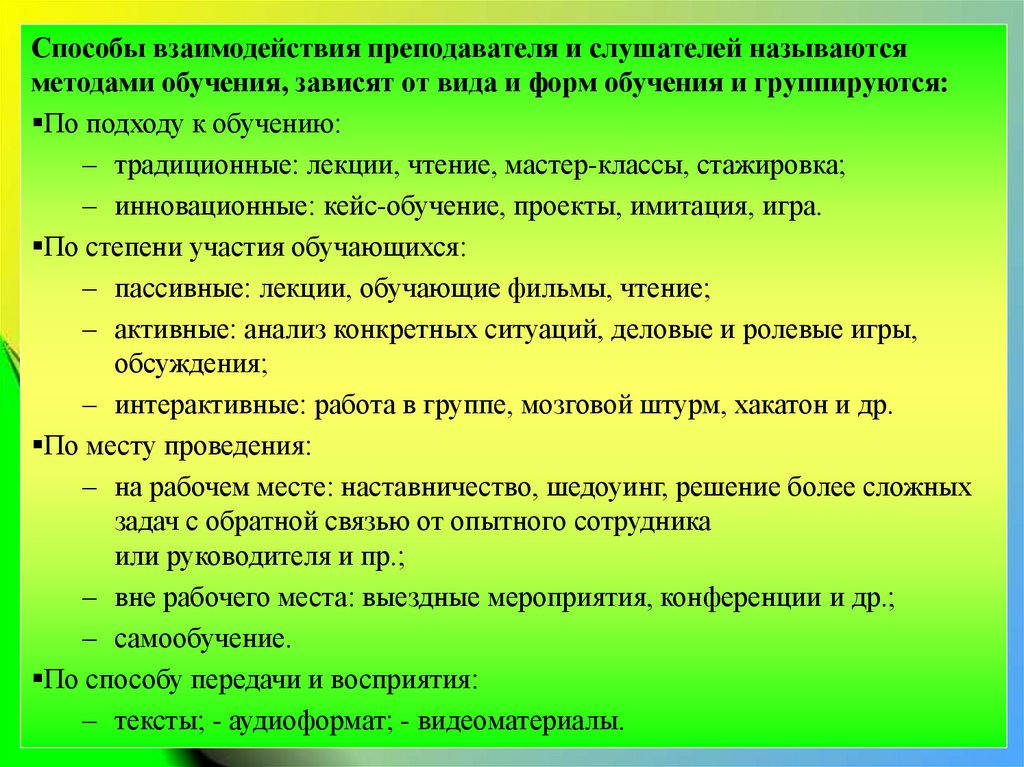 – интерактивные: работа в группе, мозговой штурм, хакатон и др.
