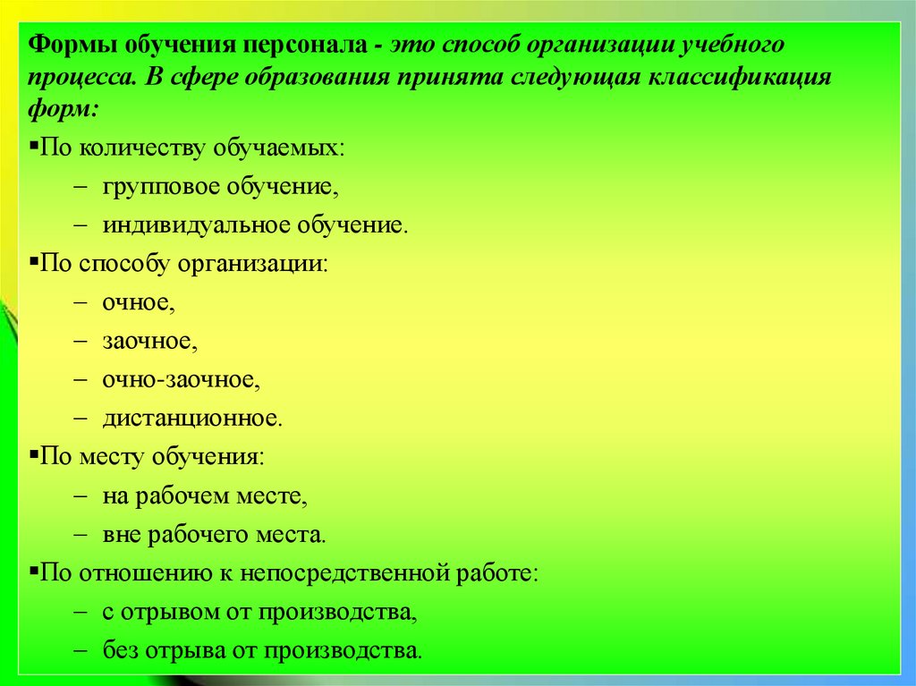 Формы обучения персонала - это способ организации учебногопроцесса. В сфере образования принята следующая классификация