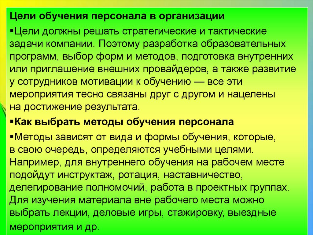 Цели обучения персонала в организацииЦели должны решать стратегические и тактические