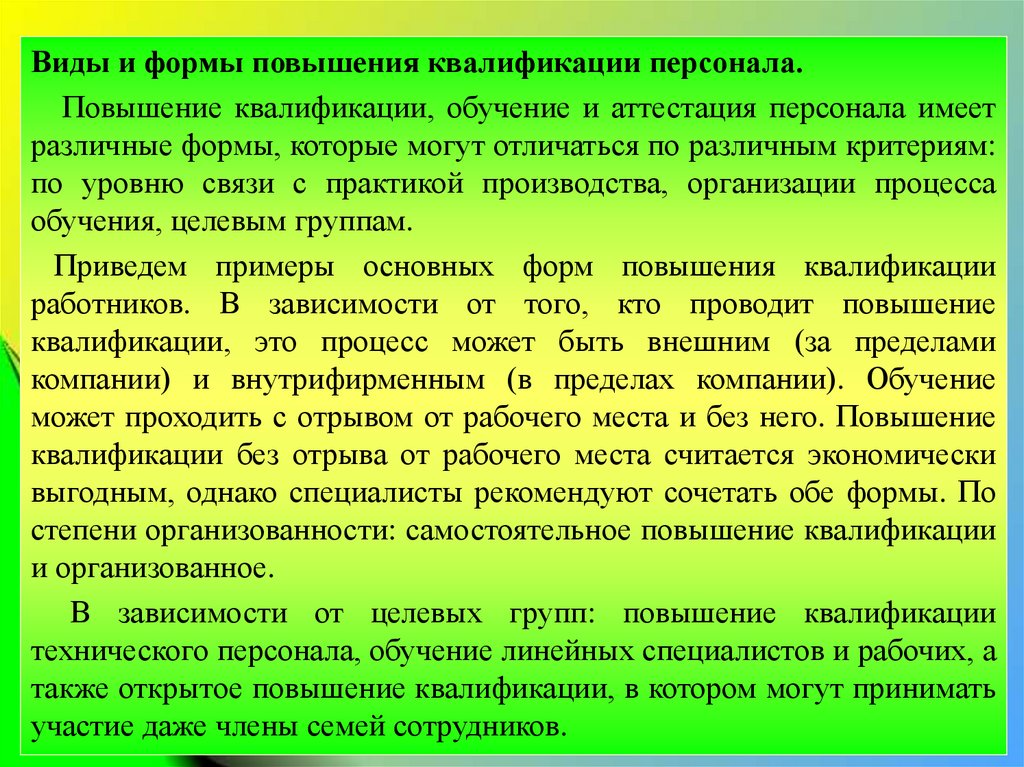 Виды и формы повышения квалификации персонала.Повышение квалификации, обучение и аттестация персонала имеет