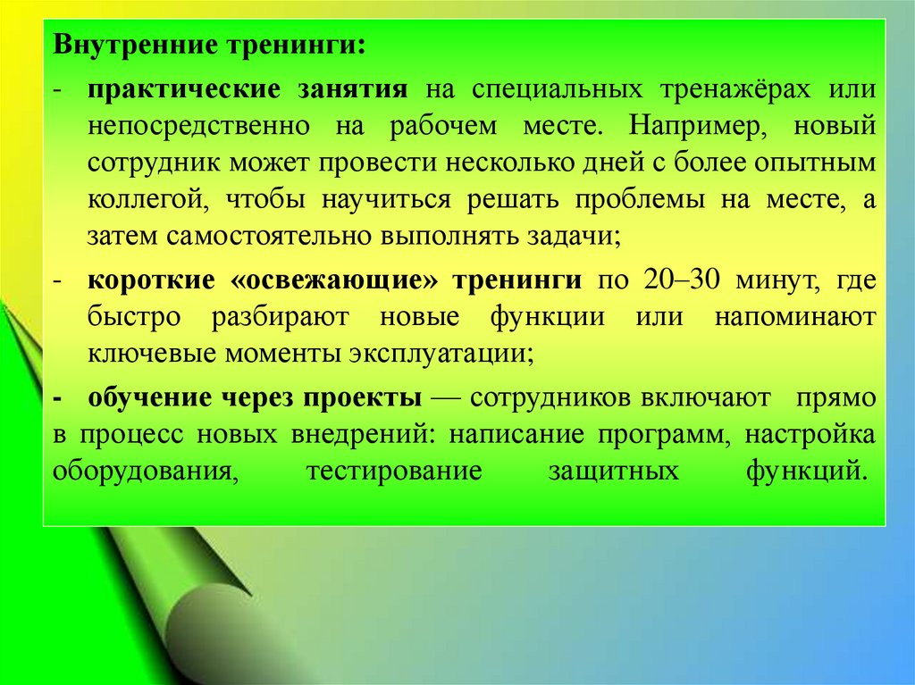 Внутренние тренинги:- практические занятия на специальных тренажёрах или