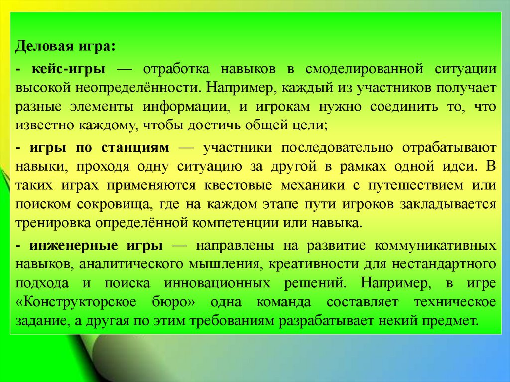 Деловая игра:- кейс-игры — отработка навыков в смоделированной ситуации