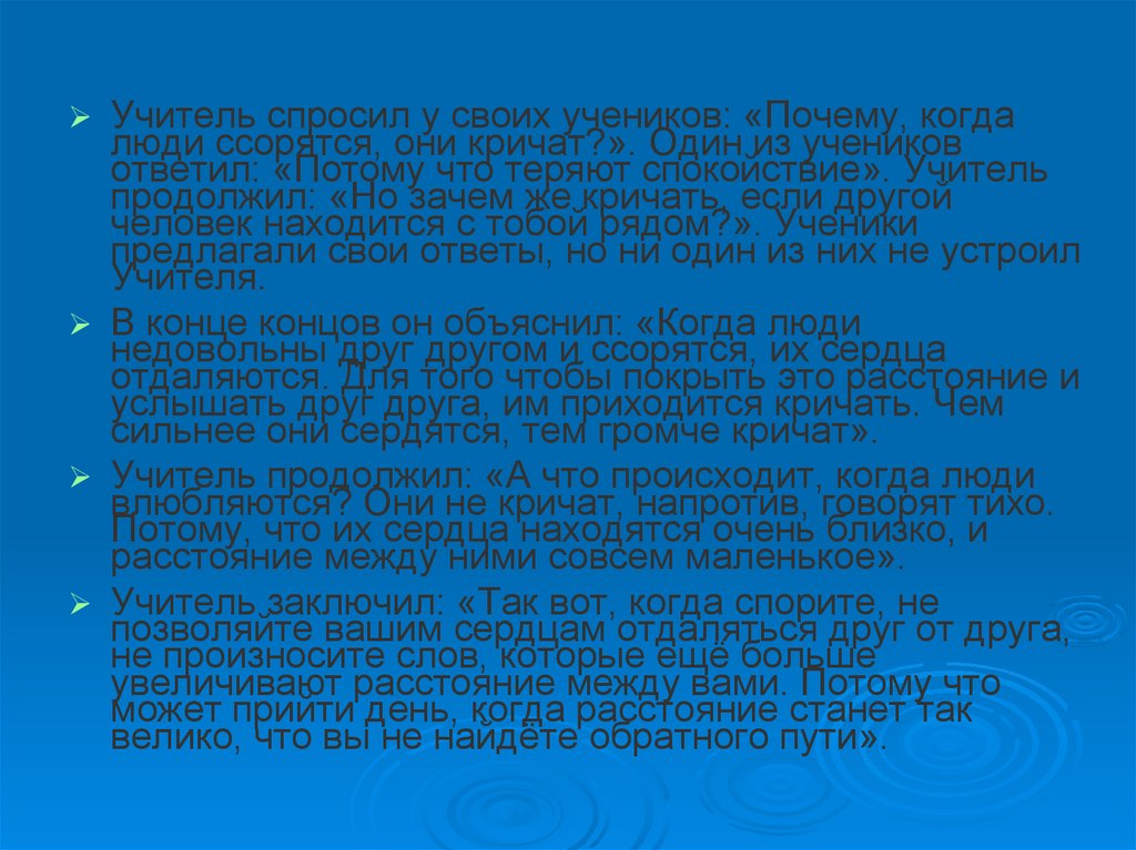 Учитель спросил у своих учеников: «Почему, когдалюди ссорятся, они кричат?». Один из учеников