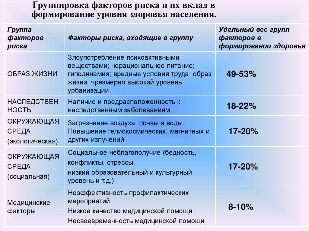 Группировка факторов риска и их вклад вформирование уровня здоровья населения.