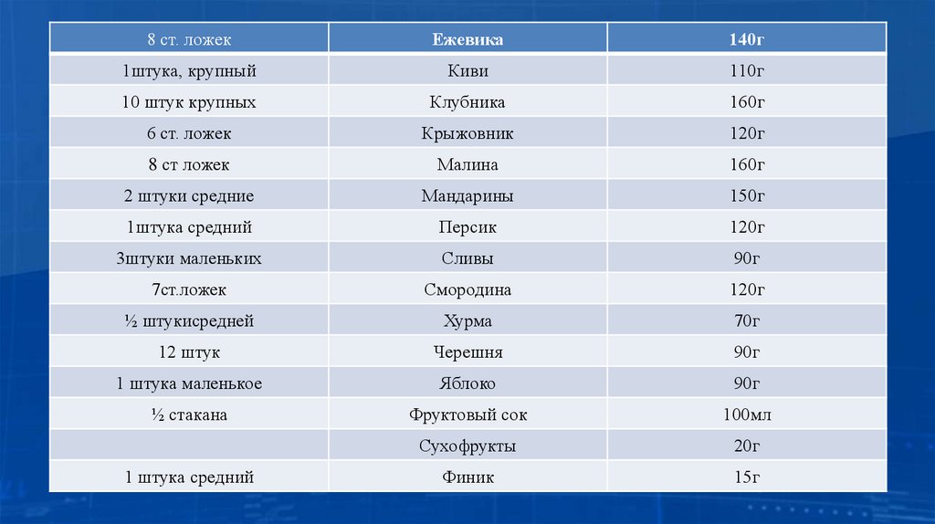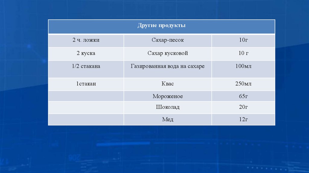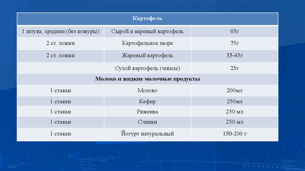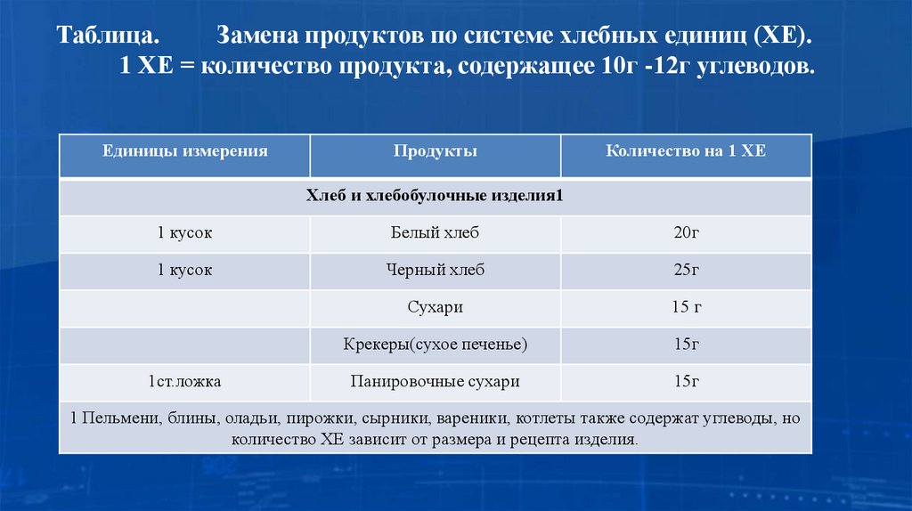 Таблица.Замена продуктов по системе хлебных единиц (ХЕ).
