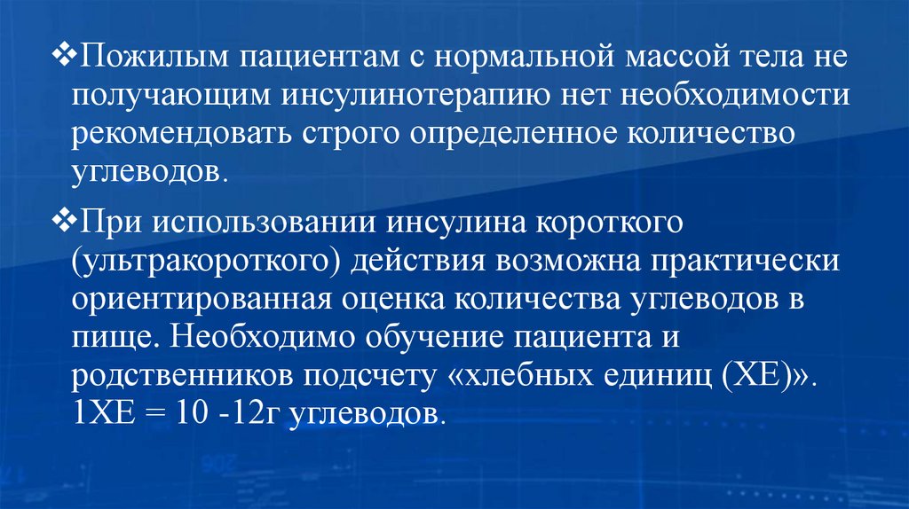 Пожилым пациентам с нормальной массой тела неполучающим инсулинотерапию нет необходимости