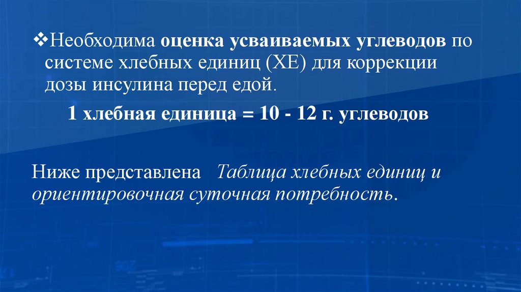 Необходима оценка усваиваемых углеводов посистеме хлебных единиц (ХЕ) для коррекции