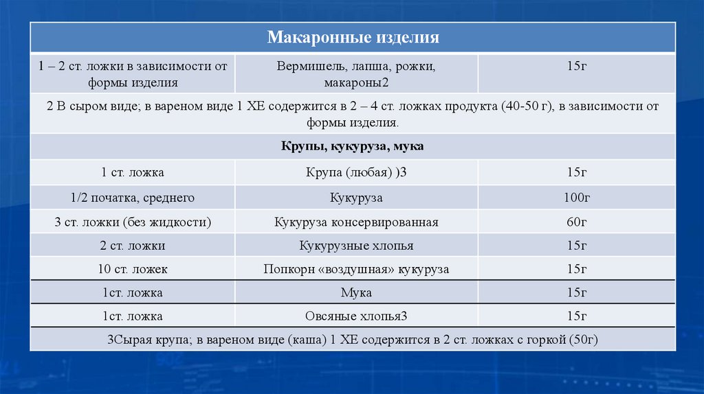 2 В сыром виде; в вареном виде 1 ХЕ содержится в 2 – 4 ст. ложках продукта (40-50 г), в зависимости от
