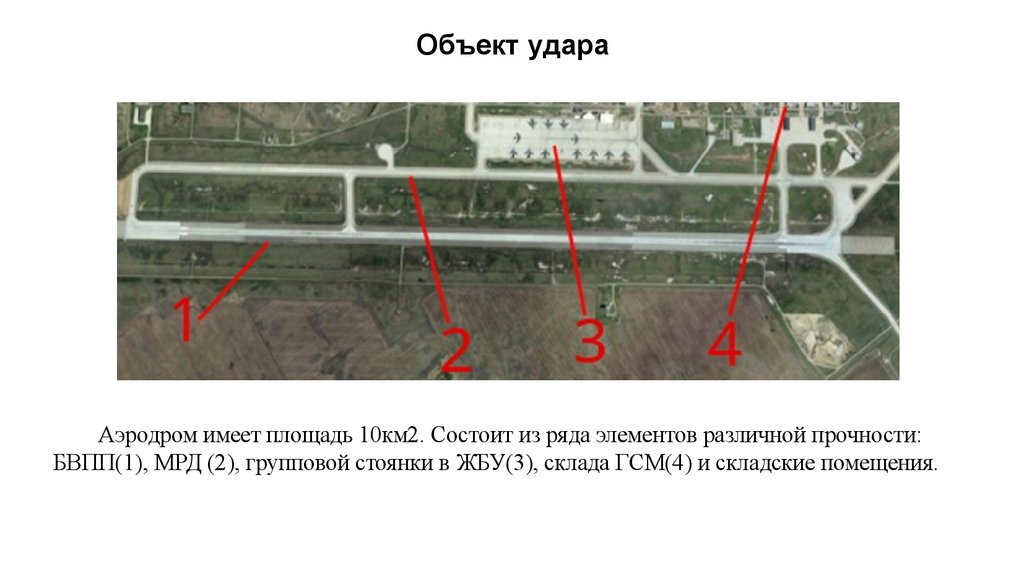 Объект удараАэродром имеет площадь 10км2. Состоит из ряда элементов различной прочности: