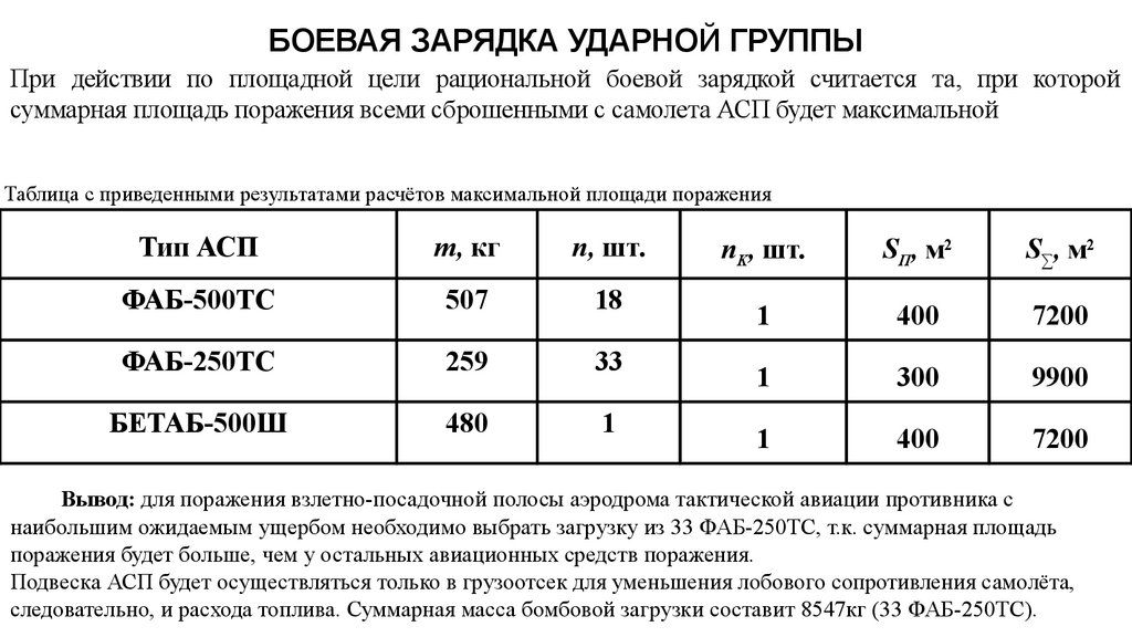 следовательно, и расхода топлива. Суммарная масса бомбовой загрузки составит 8547кг (33 ФАБ-250ТС).