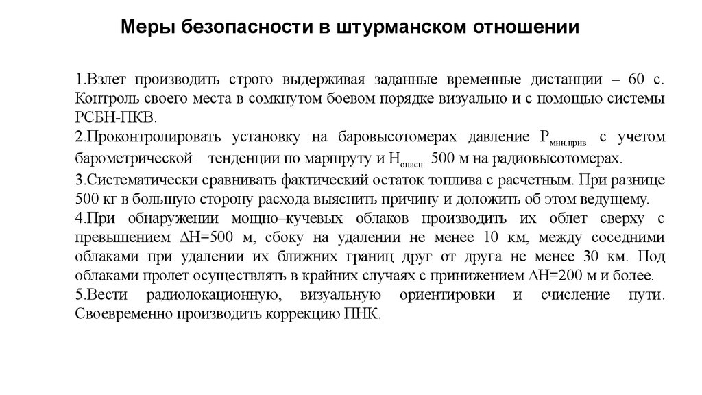 Меры безопасности в штурманском отношении1.Взлет производить строго выдерживая заданные временные дистанции – 60 с.