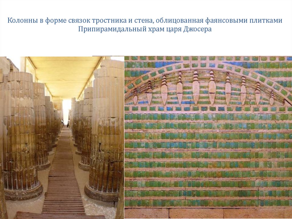 Колонны в форме связок тростника и стена, облицованная фаянсовыми плиткамиПрипирамидальный храм царя Джосера