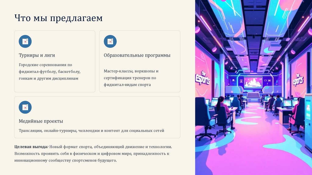 Целевая выгода: Новый формат спорта, объединяющий движение и технологии.