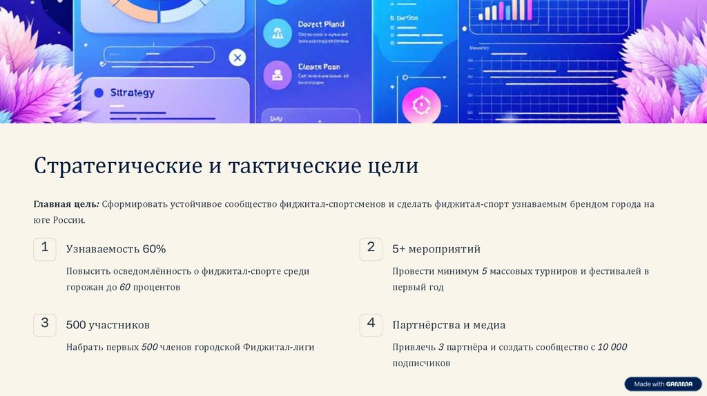 Стратегические и тактические целиГлавная цель: Сформировать устойчивое сообщество фиджитал-спортсменов и сделать фиджитал-спорт узнаваемым брендом города на