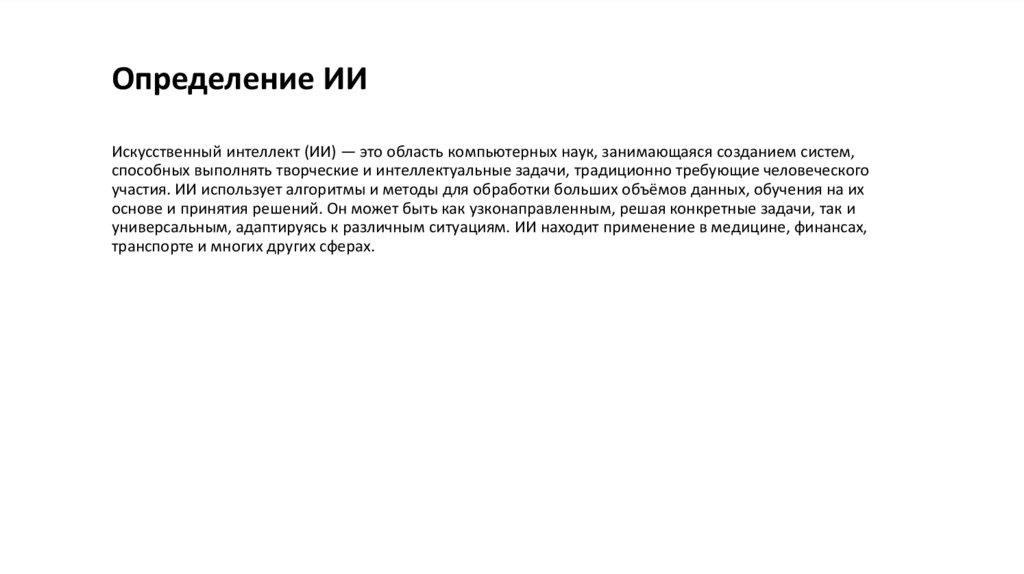Определение ИИИскусственный интеллект (ИИ) — это область компьютерных наук, занимающаяся созданием систем,