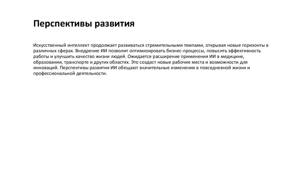 Перспективы развитияИскусственный интеллект продолжает развиваться стремительными темпами, открывая новые горизонты в