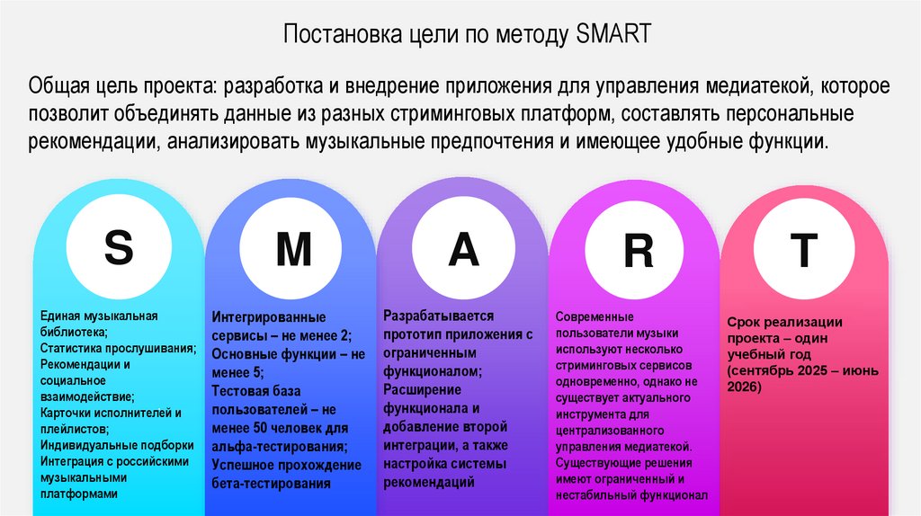 Постановка цели по методу SMARTОбщая цель проекта: разработка и внедрение приложения для управления медиатекой, которое