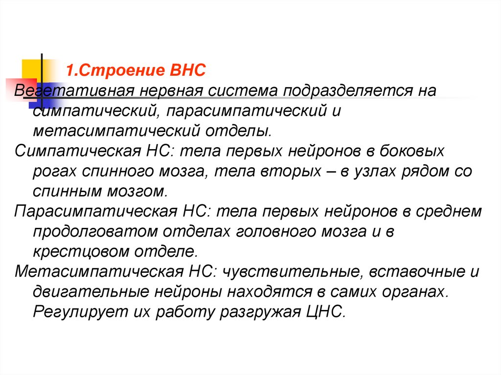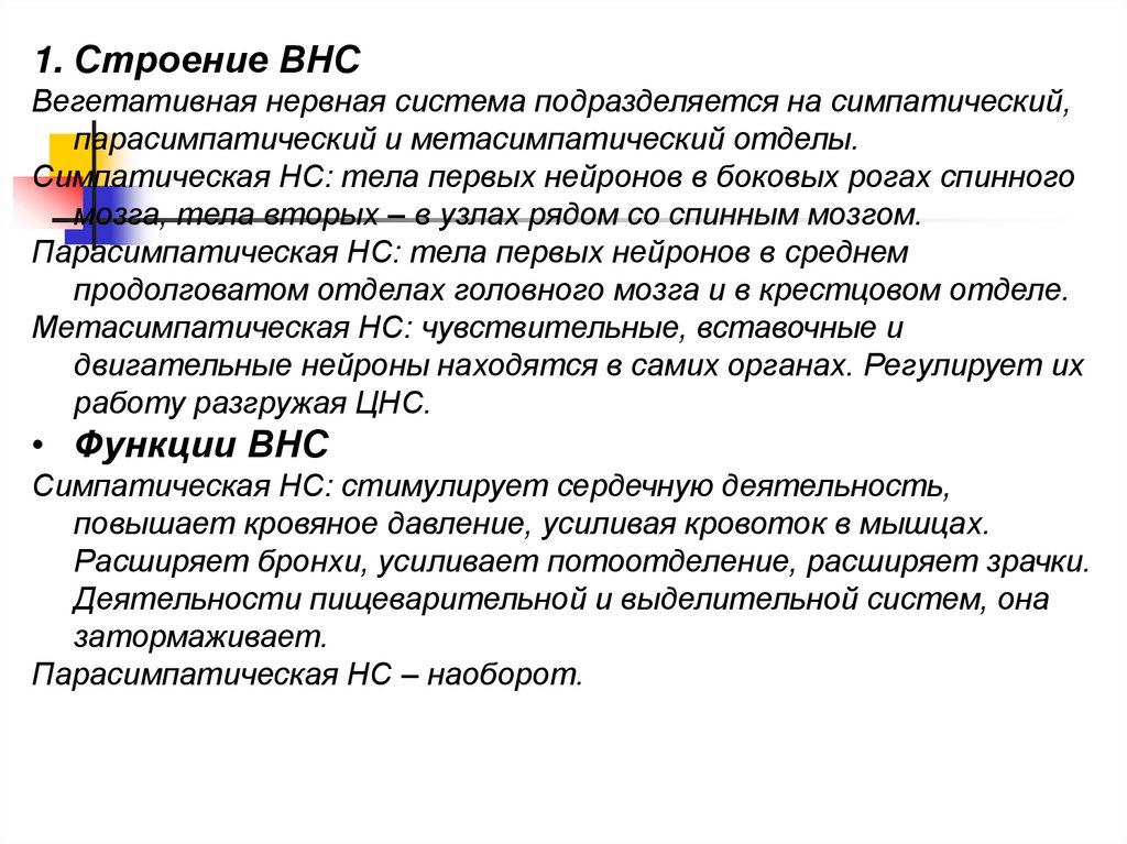 1. Строение ВНСВегетативная нервная система подразделяется на симпатический,