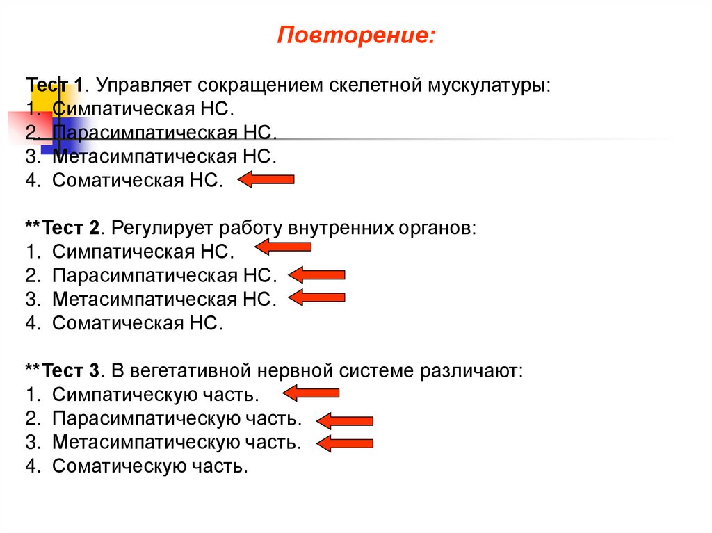 Повторение:Тест 1. Управляет сокращением скелетной мускулатуры: