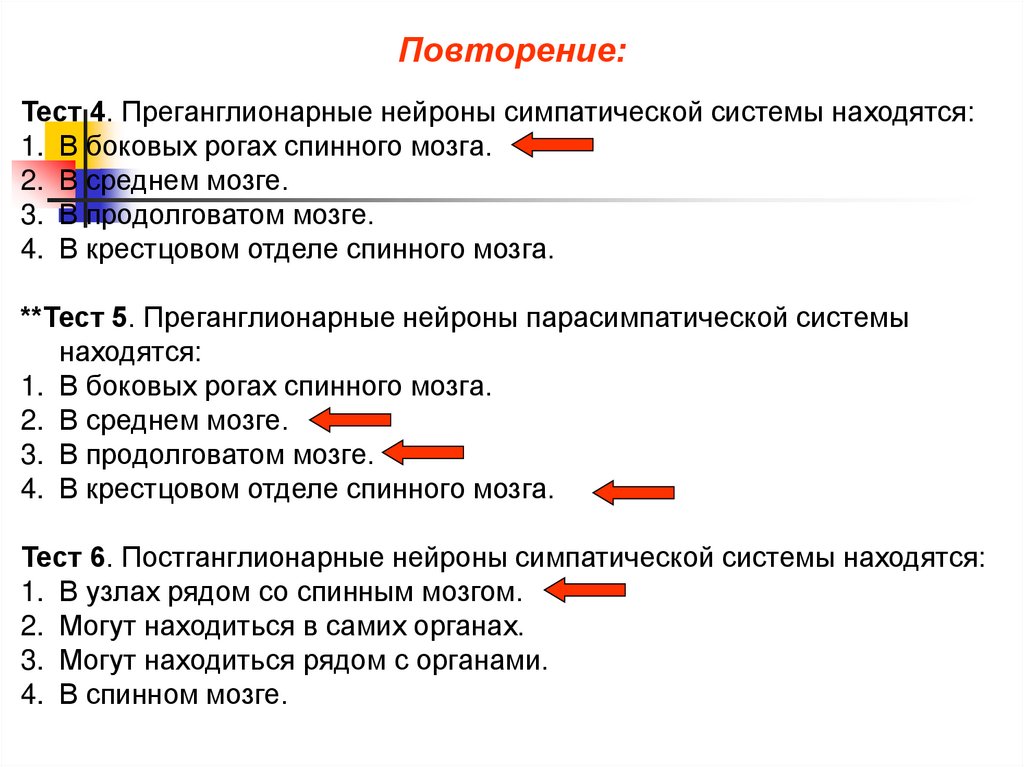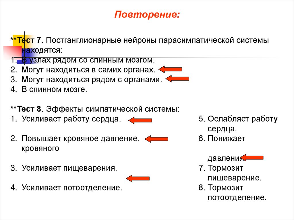Повторение:**Тест 7. Постганглионарные нейроны парасимпатической системы