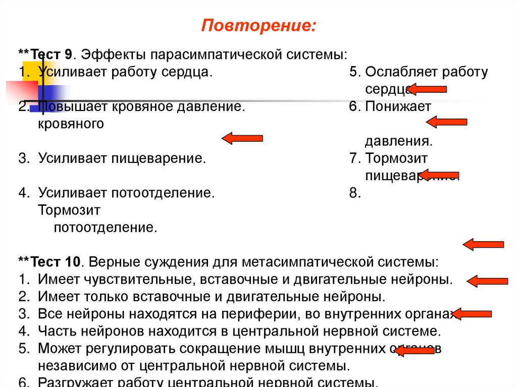 Повторение:**Тест 9. Эффекты парасимпатической системы: