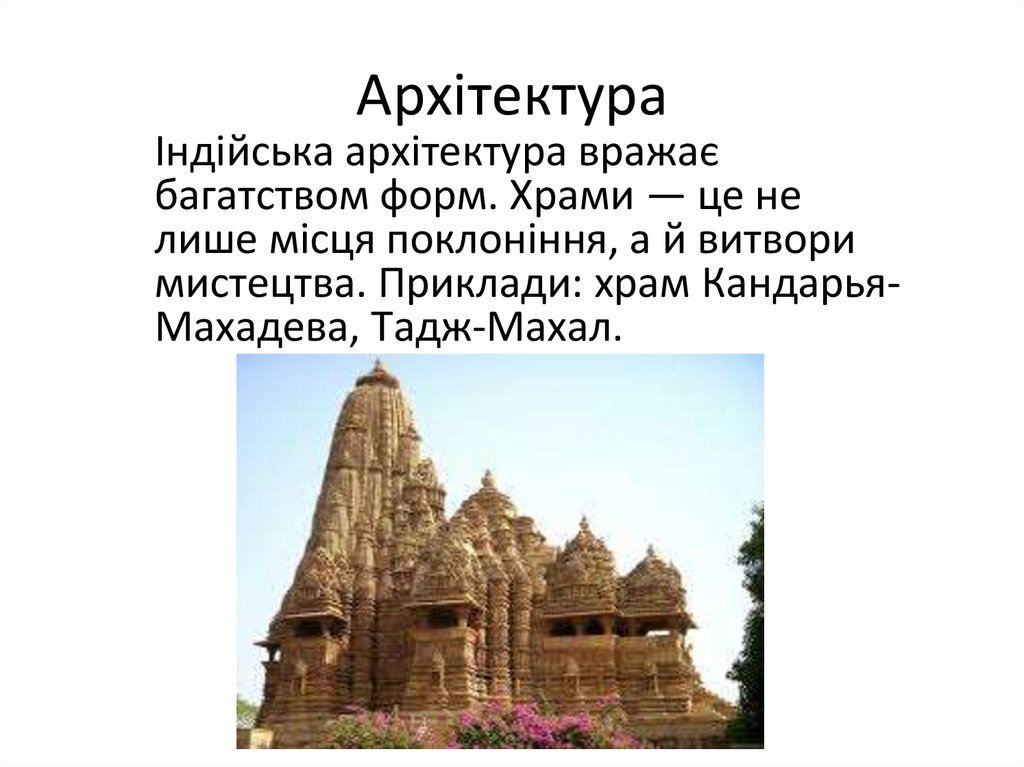 мистецтва. Приклади: храм КандарьяМахадева, Тадж-Махал.