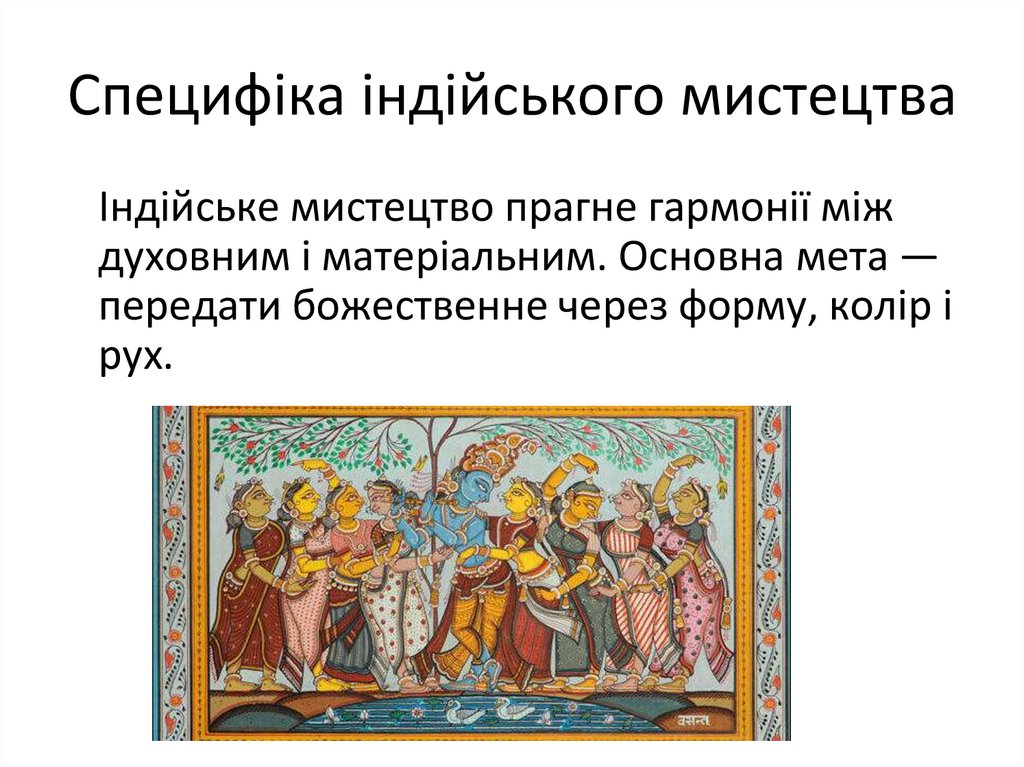 Специфіка індійського мистецтваІндійське мистецтво прагне гармонії між
