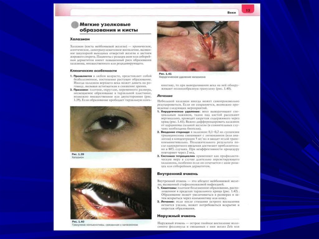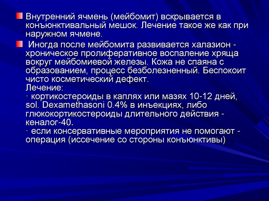 Внутренний ячмень (мейбомит) вскрывается вконъюнктивальный мешок. Лечение такое же как при
