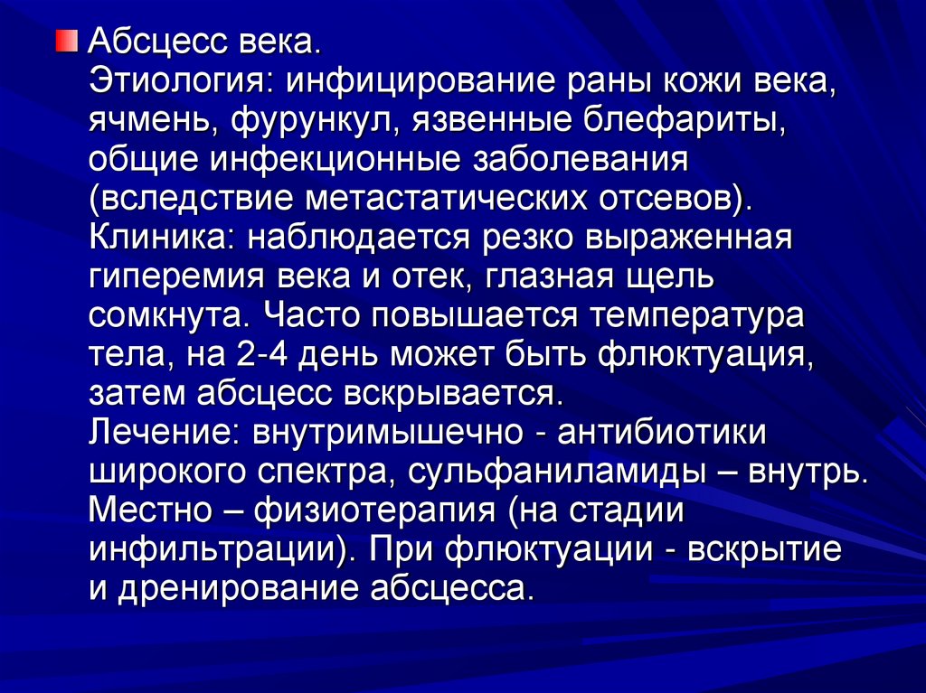 Абсцесс века.Этиология: инфицирование раны кожи века,