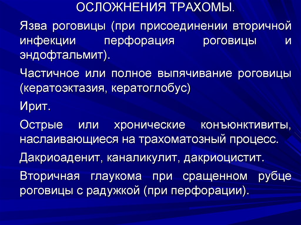 ОСЛОЖНЕНИЯ ТРАХОМЫ.Язва роговицы (при присоединении вторичной