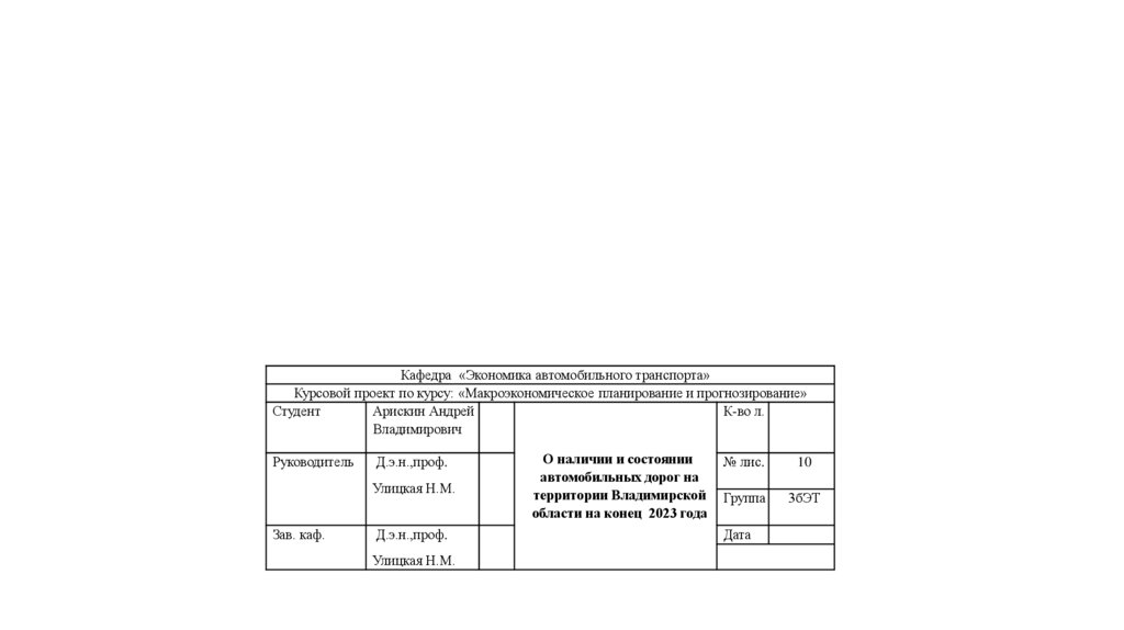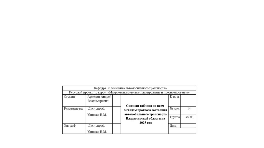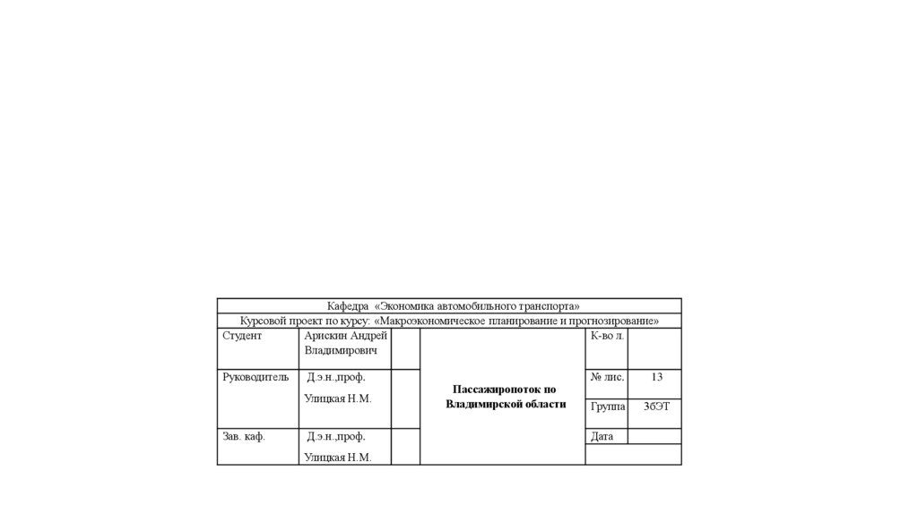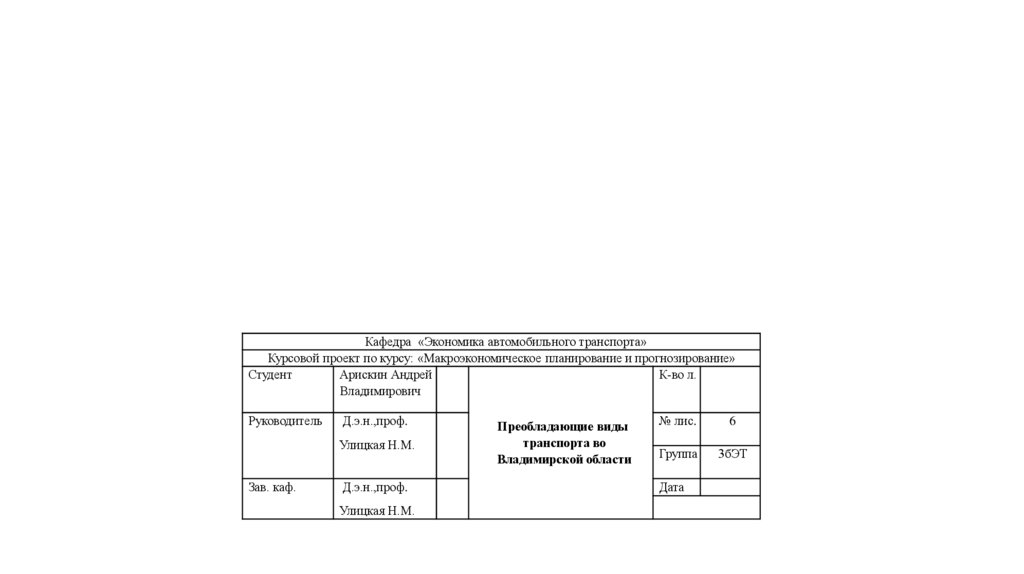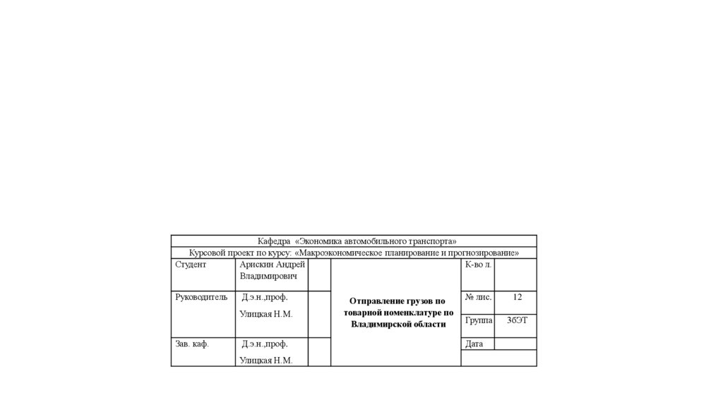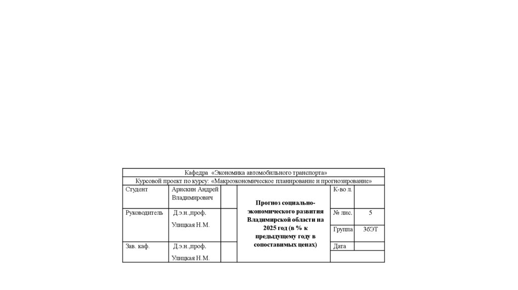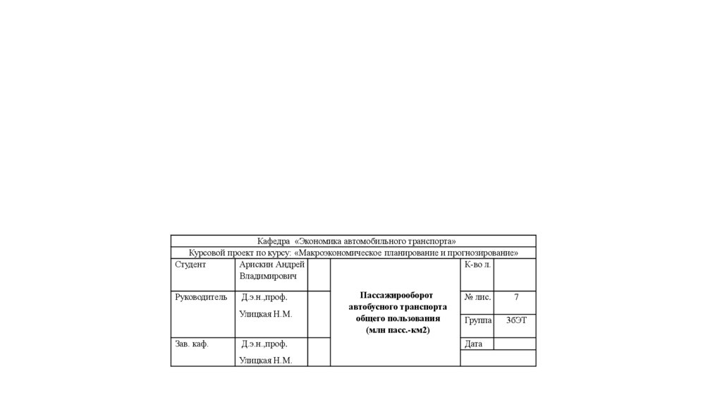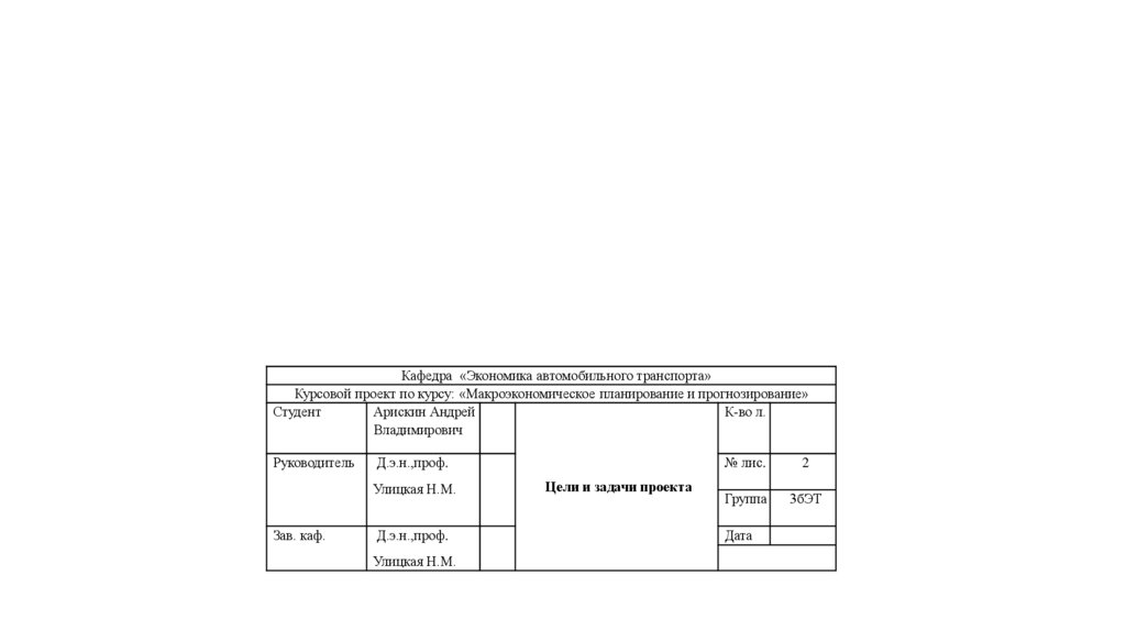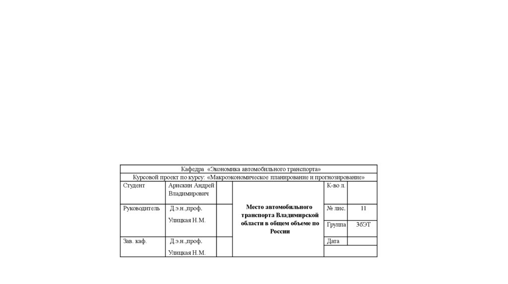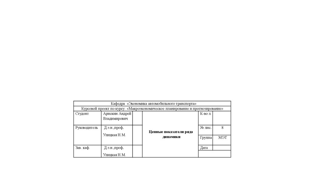 Кафедра «Экономика автомобильного транспорта»Курсовой проект по курсу: «Макроэкономическое планирование и прогнозирование»