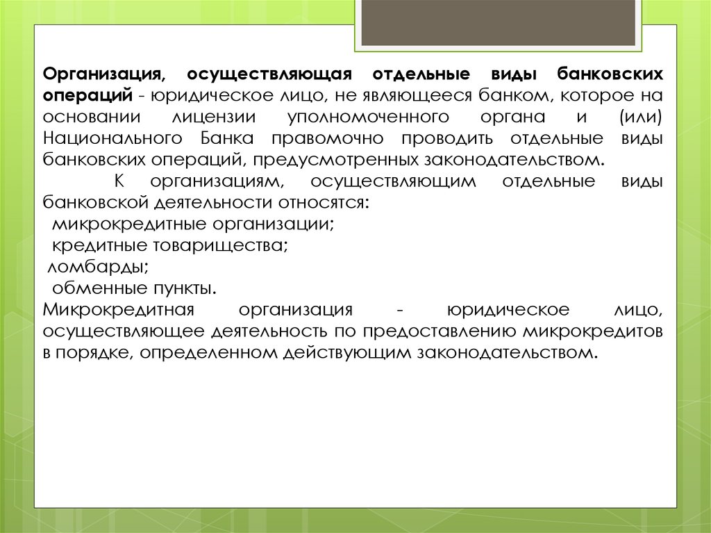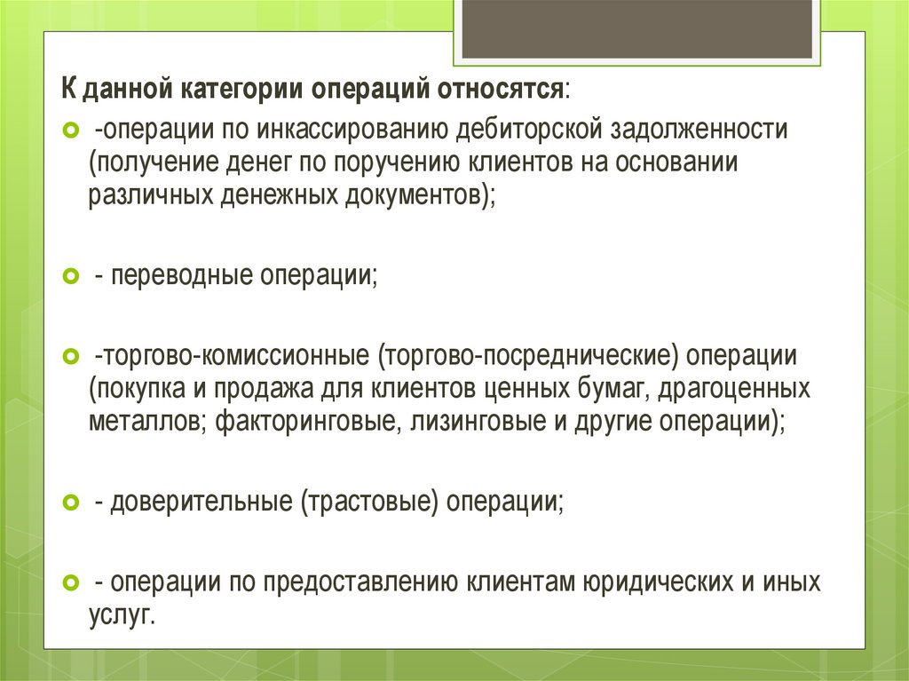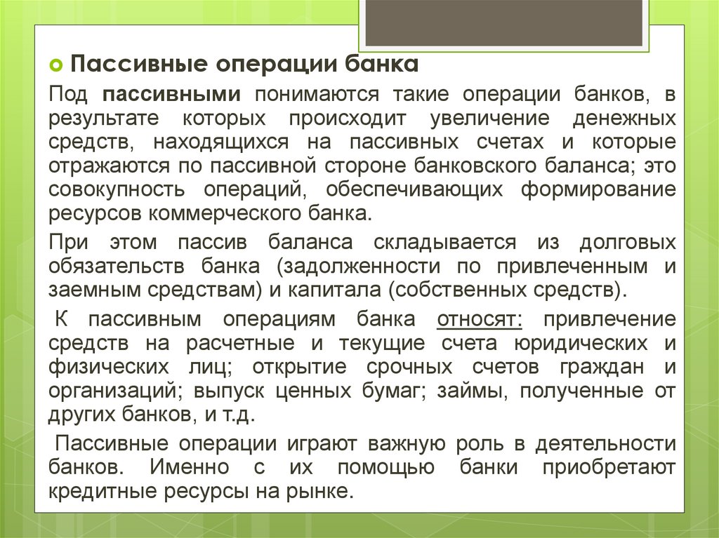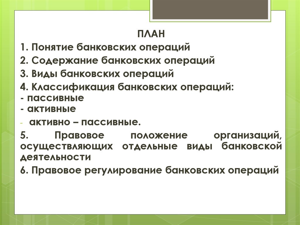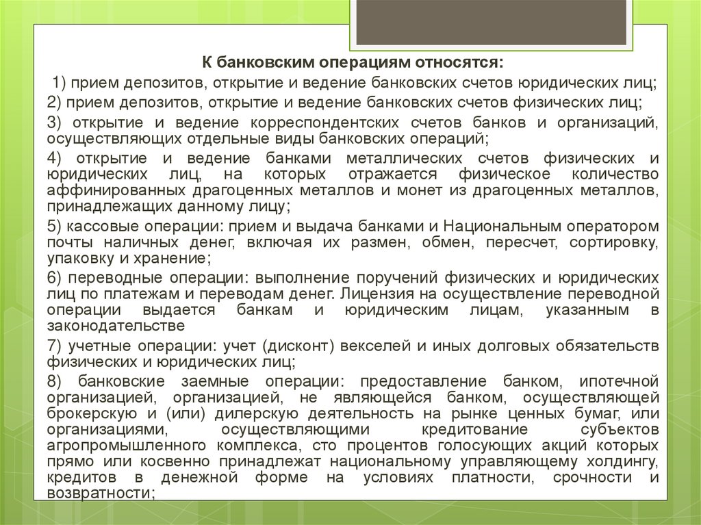 К банковским операциям относятся:1) прием депозитов, открытие и ведение банковских счетов юридических лиц;