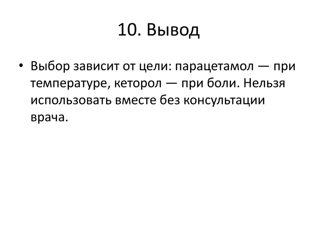 10. Вывод• Выбор зависит от цели: парацетамол — при
