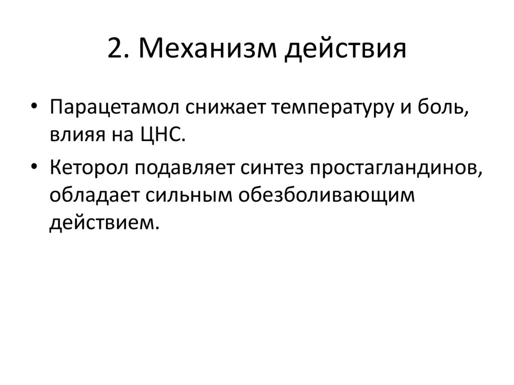 2. Механизм действия• Парацетамол снижает температуру и боль,