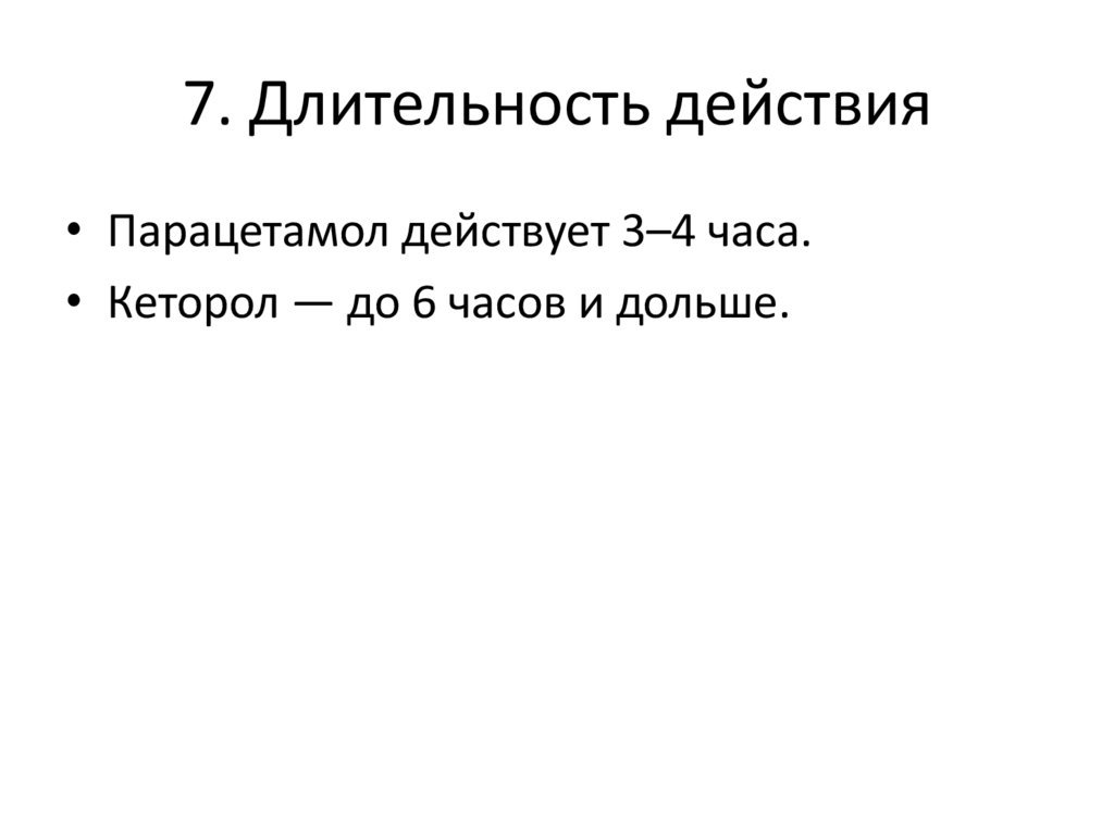 7. Длительность действия• Парацетамол действует 3–4 часа.