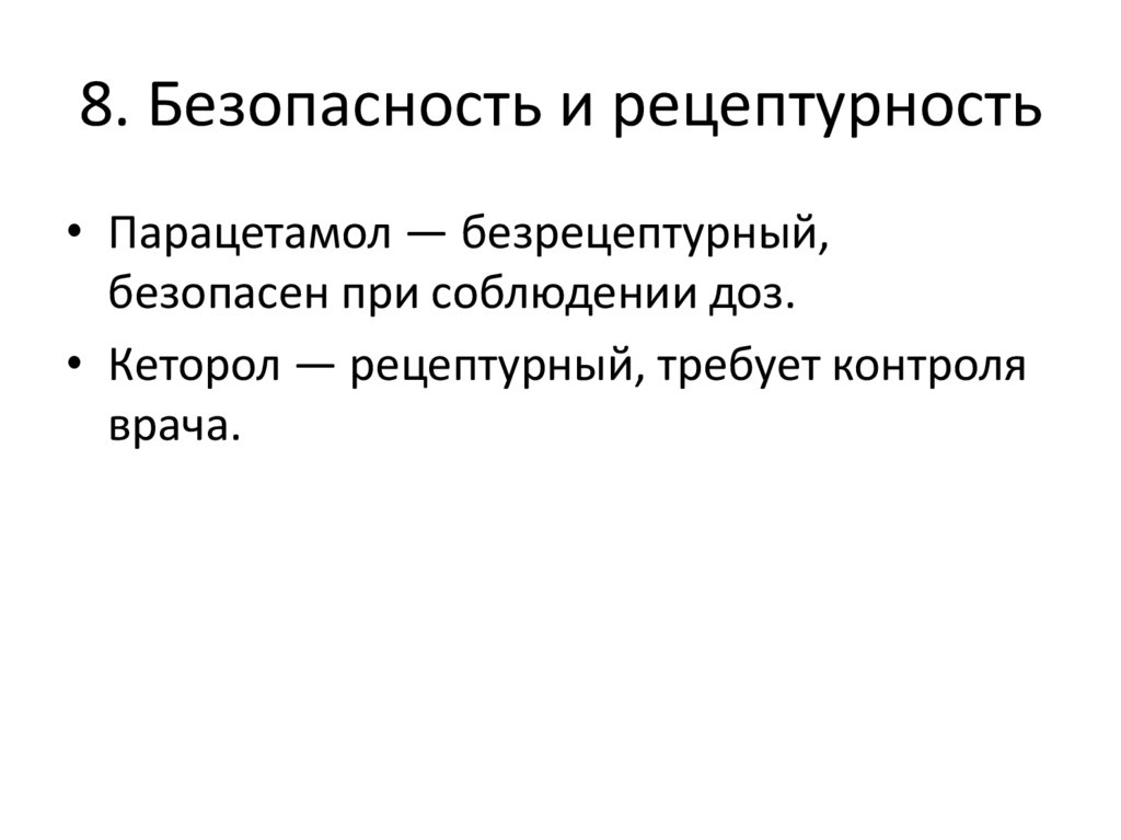 8. Безопасность и рецептурность• Парацетамол — безрецептурный,