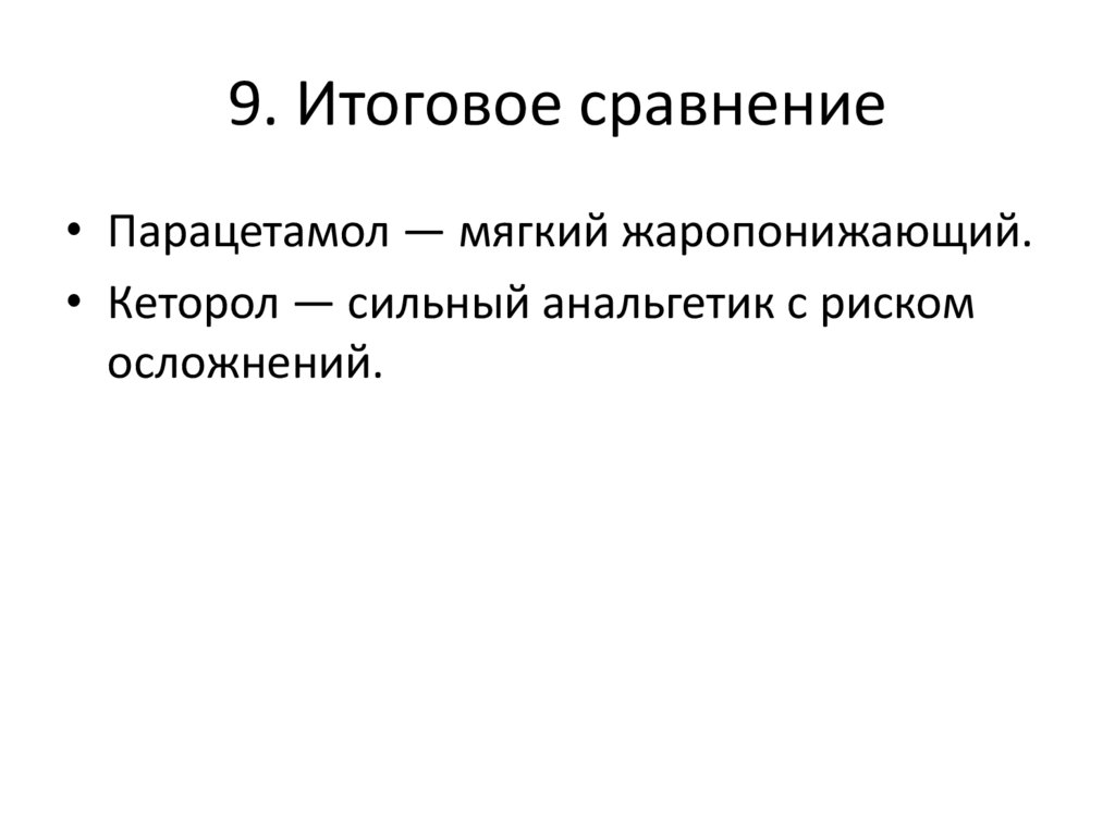 9. Итоговое сравнение• Парацетамол — мягкий жаропонижающий.