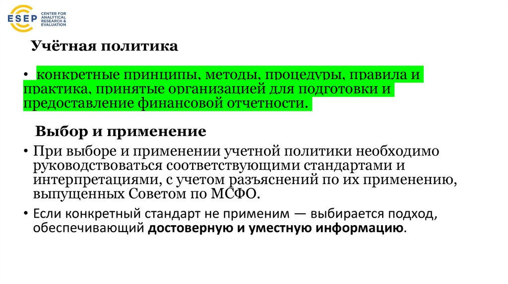 Учётная политика• конкретные принципы, методы, процедуры, правила и